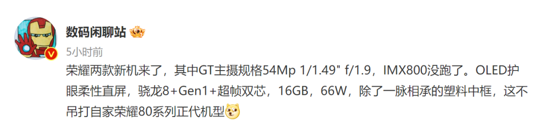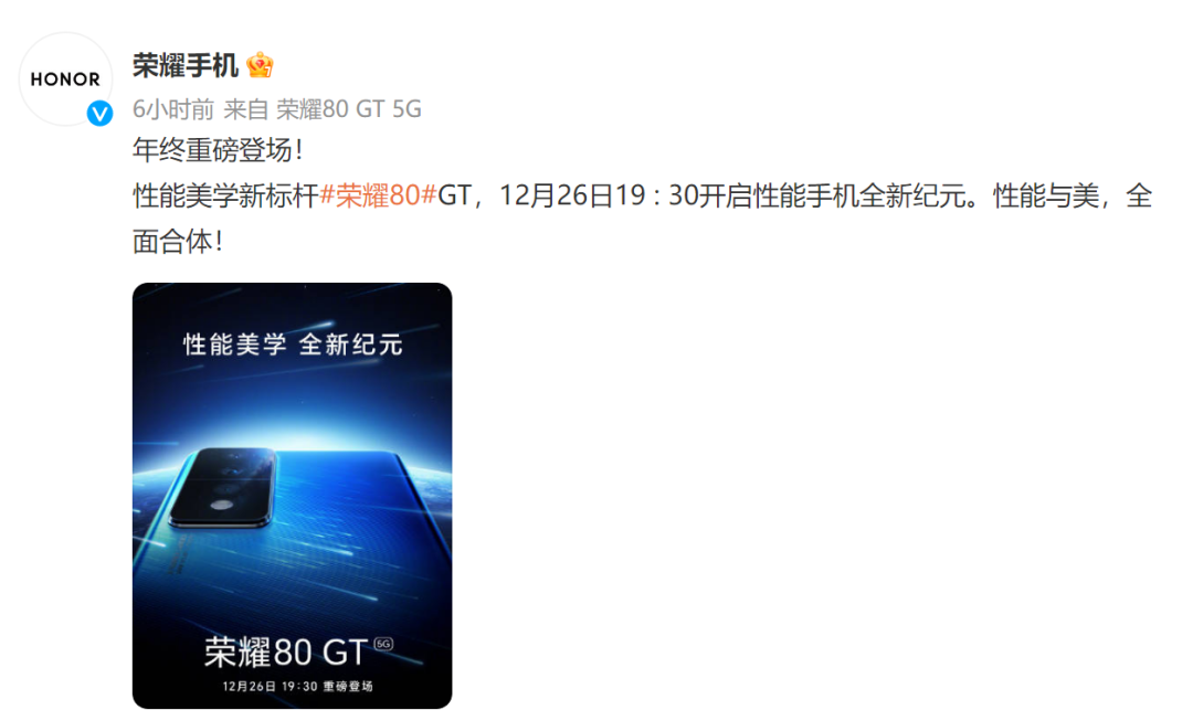 今日,荣耀官方正式宣布荣耀全场景新品发布会将于 12 月 26 日 19:30 举行。随后@荣耀手机 官宣,“性能美学新标杆荣耀80 GT ,12月26日19 : 30开启性能手机全新纪元。性能与美,全面合体!”此外,官方还公布了荣耀80 GT 为三体动画第一季官方指定产品。结合官方公布的海报来看,荣耀80 GT的正面配备了一块直屏,并采用了中置打孔的设计。此外,该机的机身背部后置三摄,整体采用了竖直排列的方式,后壳也似乎采用了特殊工艺,营造出类似流星的效果。另据数码博主@数码闲聊站 透露,荣耀80 GT采用5400万像素(1/1.49", f/1.9光圈)主摄,预计为IMX800,配备OLED护眼柔性直屏,搭载骁龙8+Gen1+超帧双芯,16GB内存,支持66W充电,搭配塑料中框。除了荣耀80 GT手机,荣耀平板V8 Pro也将在12月26日发布。据@荣耀智慧生活 透露,荣耀平板V8 Pro是全球首款搭载MagicOS 7.0操作系统的大屏旗舰平板,将为消费者带来越用越好用,越用越懂你的全新智慧高效体验,并有六大全球首发,号称“智慧互联,流转诚心如意”。目前荣耀平板V8 Pro已经开启预约,从海报可以看出,该平板采用采用大尺寸的全面屏设计,搭配极窄边框,另有多款颜色可选,并且支持手写笔和键盘。此前的爆料显示,荣耀平板V8 Pro预计搭载一块12.1英寸的高刷大屏,采用LCD材质,并搭载联发科天玑8100处理器。这也是该处理器首次在平板产品上登场。据悉,天玑 8100 处理器采用台积电 5nm 制程,CPU 部分包含 4 个 2.85GHz A78 核心 + 4 个 2.0GHz A55 核心,GPU 为 Mali-G610。至于产品的更多信息,还有待官方后续的确认,感兴趣的朋友可以保持关注。