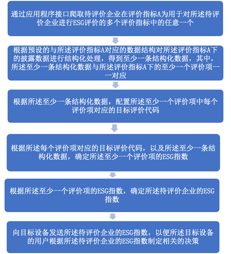 从绿色金融科技专利申请总数来看,2008年以来平安科技以110件绿色专利申请数排名第一,遥遥领先于其他金融科技公司。科大讯飞和金融壹账通分别以35件和22件申请数位列第二和第三名。表1:2008年至今23家金融科技公司绿色金融科技专利申请总数排名平安科技是平安集团旗下科技解决方案专家,践行“科技赋能金融、科技驱动生态”的企业使命,对集团金融服务、医疗健康、汽车服务和智慧城市生态圈建设起到了推动作用。平安科技注重绿色发展。目前,平安科技将和国内一些城市的环保部门达成合作,打造环境数据中心,全方位着力构建智能环保城市。通过环境数据中心,对环境数据进行全面整合,实现环保信息统一规则,利用大数据和AI技术对环境问题进行智能化分析和处理。由于现有对企业进行ESG评价的过程中仍然以人工为主,比如,依赖于人工阅读企业大量的披露报告和相关新闻,在每个评价维度对企业进行ESG打分,得到该企业的ESG评分。这样的ESG评价程序效率慢,且主观性强。本专利提供了一种基于代码可配置的企业ESG指数确定方法及相关产品,通过结构化处理以及评价代码的调用,实现自动化对待评价企业进行ESG评价,提高了ESG评价效率以及避免了人工评价带来的主观性问题。图 2 为该确定方法的图示。随着科学技术的发展,国家以及社会个人越来越重视对环境的保护,因此,投入较多物资和人资用于环境污染物的检测。然而相关技术中,常常采用的环境污染预测模型大多只对单一监测站点的数据进行预测,得到被监测的单一站点污染物的变化趋势,从而不能很好地反映空间信息对目标监测站点的影响。另外,用传统模型很难给出短期变化的预测。为了克服以上技术问题,该专利使用人工智能技术,可以缩短预测的时间周期,同时得到环境污染物变化趋势也更为精准,提高了预估出的环境污染物的精度,方便对监测站点污染物变化做出快速的响应。图3为该方法一种实施方式的示意图。从绿色金融科技专利申请占总专利申请的比例来看,有数科技以14.29%的比例排名第一,其次依次为白鸽在线和致星科技。表2:2008年至今23家金融科技公司绿色金融科技专利占比有数科技是一家专业的数据智能应用服务商,立足企业征信,为金融、政府、产业场景提供特色的数智产品,助力数字经济高质量发展。有数科技帮助金融机构通过数据发现企业各维度的价值特征,提供精准金融服务,助力金融机构开展绿色金融、科创金融、涉农金融、产业链金融等创新金融业务。当前,我国正在推行建设绿色金融试点改革。在推动银行机构实施企业绿色贴标时,亟需一种企业绿色金融方面的评定好方法。目前对于企业的绿色评定方法基本处于空白,即便有的少数企业评定方法,也基本跟绿色金融领域关联甚少,而且还基本存在评定方法简单,评价指标维度单一,评价模型准确性不足等问题。该专利提供了一种切实有效对企业的绿色金融领域进行评估的方法,具有一定的准确性和可落地性。图4为该方法的示意图。综上,零壹智库得出两点规律。首先,金融科技公司申请的绿色金融科技专利数量较少,未来还有很大的增长空间。其次,目前金融科技公司的绿色金融科技专利主要投入集中在解决运行效率问题的场景,例如应用大数据、人工智能、云计算等技术提升绿色标准、项目识别、环境效益测算和ESG指数编制等方面。但对可以解决信息透明度、可靠性和可追溯性问题的区块链和物联网等技术的创新和应用比较欠缺。目前,我国绿色金融科技的发展还存在着不少挑战。比如,数据统计和信息披露制度不健全、信息基础设施建设不完善、绿色金融科技人才缺乏等。未来,相信在不断完善的政策与制度框架下,我国绿色金融科技的发展会迈上新的台阶,从而助力“双碳”目标的实现。