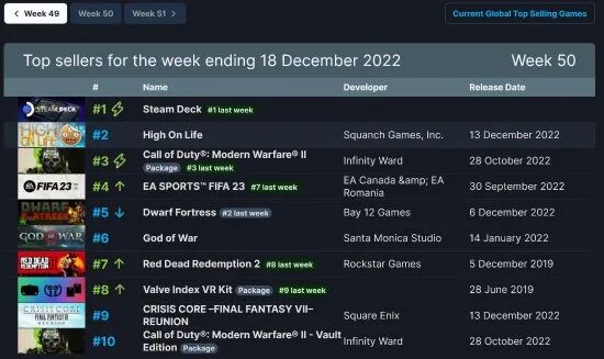 Steam新一周(截至12月18日)销量榜公开,V社掌机Steam Deck依旧稳居第一,实现五连冠。喜剧科幻FPS游戏《High On Life》冲上销量榜单第二,《使命召唤19:现代战争2》登榜单第三、第十,《荒野大镖客:救赎2》上榜。(以下榜单有多个《使命召唤19:现代战争2》,可能是不同区服以及预购版游戏)完整榜单:1.Steam Deck2.《High On Life》3.《使命召唤19:现代战争2》4.《FIFA 23》5.《矮人要塞》6.《战神》7.《荒野大镖客:救赎2》8.V社VR套件9.《最终幻想7:核心危机 重聚》10.《使命召唤19:现代战争2》