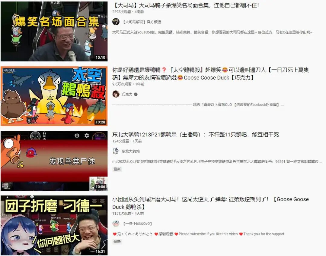 即使是在Youtube上用中文搜索《鹅鸭杀》,出来的结果竟然也是大量头部主播的“带货视频”,比如大司马、东北大鹌鹑等等,这些“不务正业”的游戏主播们自然是派对游戏最合适的带货人。16人的游戏人数上限使得主播们可以和水友粉丝直接在游戏中充分互动,同时那些高手在民间的水友大神又反哺了主播们的直播效果和直播间人气,可谓是主播、水友、游戏之间的三赢。