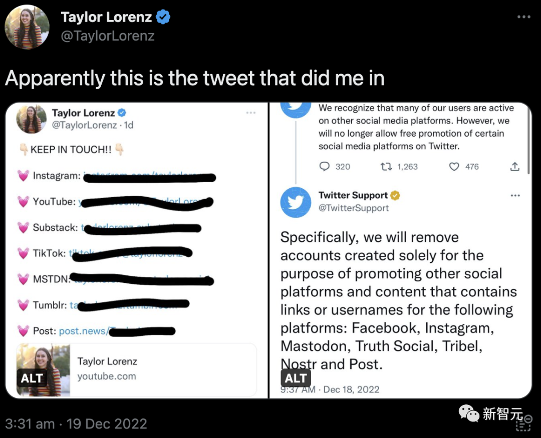 根据公告的内容,用户不能再在推特上发布被禁止的平台(如Facebook、Instagram甚至特朗普的Truth Social)的帖子,除非是同时发布到两个平台上。推特还可能封禁「以推广另一社交平台内容为主要目的」的账户,并将不再允许用户链接到第三方链接聚合器。对此,马斯克解释说:「偶尔分享链接是可以的,但不能再无情地免费为竞争对手做广告。」就连曾经的「战友」Jack Dorsey都表示:「凭啥啊?」有趣的是,就在新规正式宣布的前一天,《华盛顿邮报》记者Taylor Lorenz发现自己账号因「违规」被封了。第二天账号恢复后,她便公布了导致她被禁言的推文链接。「今后,重大的政策变化都将投票表决。我很抱歉。这种情况不会再发生了。」