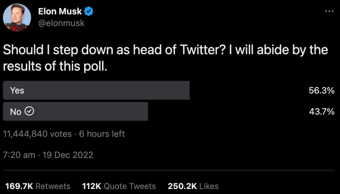 北京时间今天一早,马斯克突然在推特上发布了一个投票,内容是:「我是否应该卸任推特的负责人?」好家伙,照现在这个趋势下去,才上任不到两个月的马院士就要辞职了。