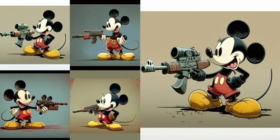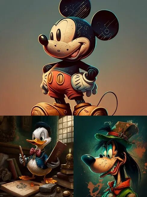 最初,他生成了几只略带写实风格的米老鼠和唐老鸭,甚至还有暗黑风格的高飞。