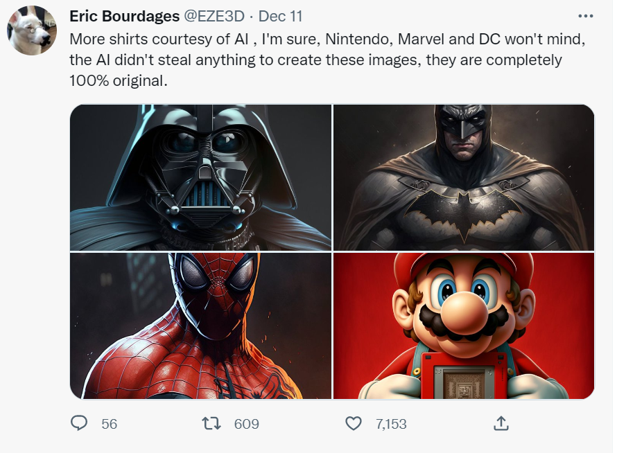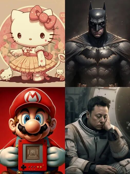 面对这样的局面,《黎明杀机》的角色主美Eric,选择了以毒攻毒。通过生成一些知名形象的图画,Eric尽情地挑衅着Midjourney公司的规则。