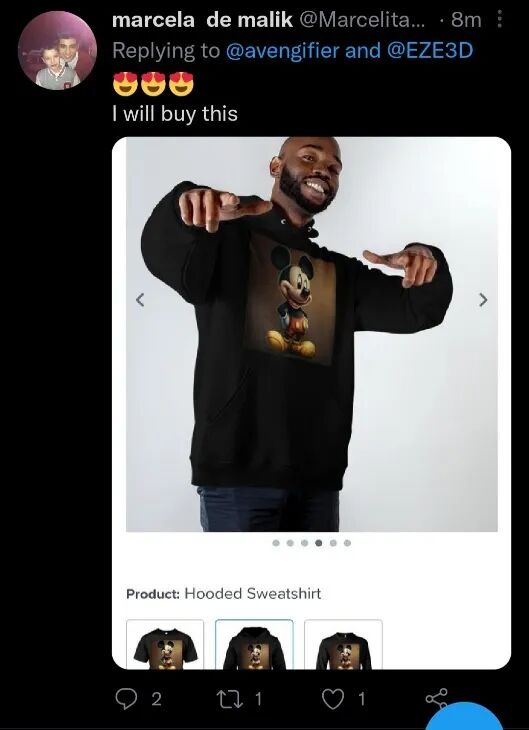 不过关于Eric“鼓励人们做周边”这件事,也确实有人照做了,印有那些米老鼠照片的T恤,大摇大摆地在网络上出售,Eric还不忘截图转发,似乎是在表明自己的阶段性胜利。