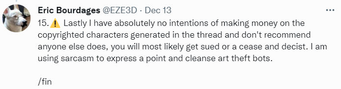 借此机会,Eric洋洋洒洒地写下了15条发言,向人们阐述自己的目的。他表示自己并没有通过这些生成图来牟利,自己只是要提醒人们,AI作图目前缺乏监管,往往是在窃取其他人的作品进行缝合,或者是生成一些可怕的东西,如果这种科技不加以约束,伪造影像、图片等谎言将层出不穷,同时他也承认,AI未来会在艺术创作中成为重要的辅助工具,但直接用这种工具去创作,则抹除了人类创作艺术时的想法、情感等因素。