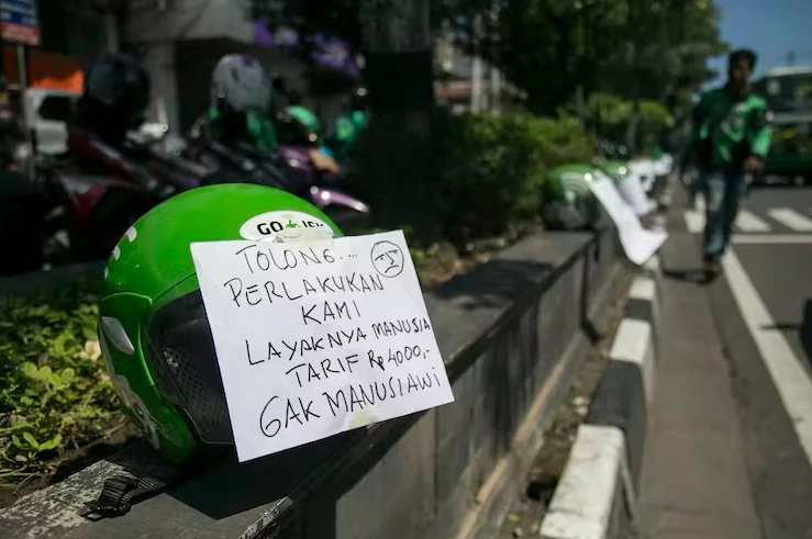 另一方面,骑手招募所宣传的口号是“自由”,但这份“自由”同样也是陷阱。Gojek公司不止一次地强调,他们旗下近两百万的骑手并不是他们的“员工”,而是他们的“合作伙伴”,这个巧妙的说法让公司不用为骑手们承担医疗保险等各种福利,甚至是等商家出餐时的停车费都得骑手们自掏腰包,而当辛苦完成的赏金再经过平台方的抽成,落到骑手手里的报酬是那样卑微。