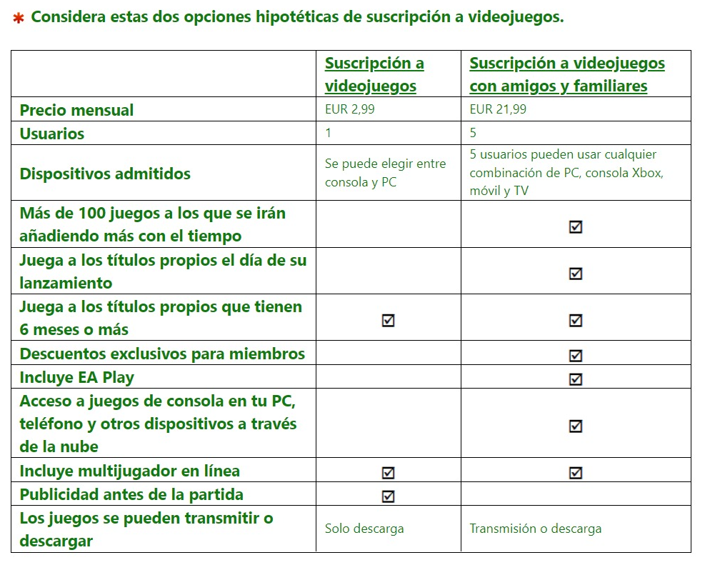 一位玩家在ResetEra上分享了自己收到的一张无来源表格截图。这张表格使用西班牙语编写,其中将微软设想的两种新订阅制度做了比较。