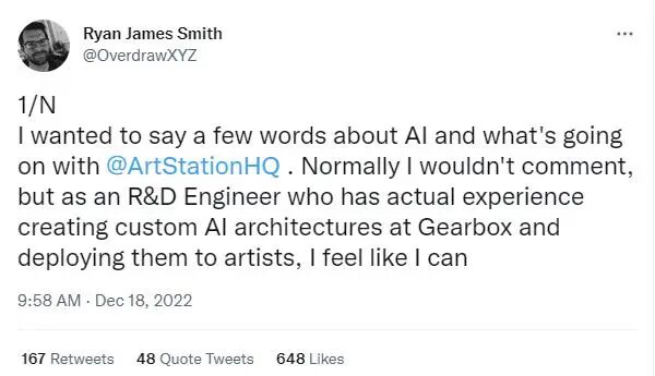 Ryan Smith在社交媒体写道,“我想对ArtStation正在进行的事情说几句话,通常来说我是不参与这类讨论的,但作为一名研发工程师,我有在Gearbox创造定制AI架构并将其部署给美术师们的实际经验,我觉得我可以用某种有意义的方式加入讨论,而不是给这个话题增加噪音”。