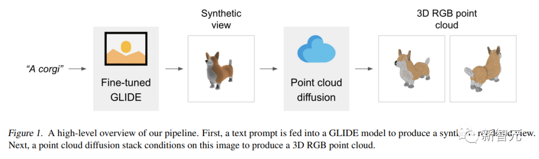 当输入一个prompt时,文本图像转化模型会生成一个合成渲染对象,该对象被馈送到图像转化3D模型,然后生成点云。