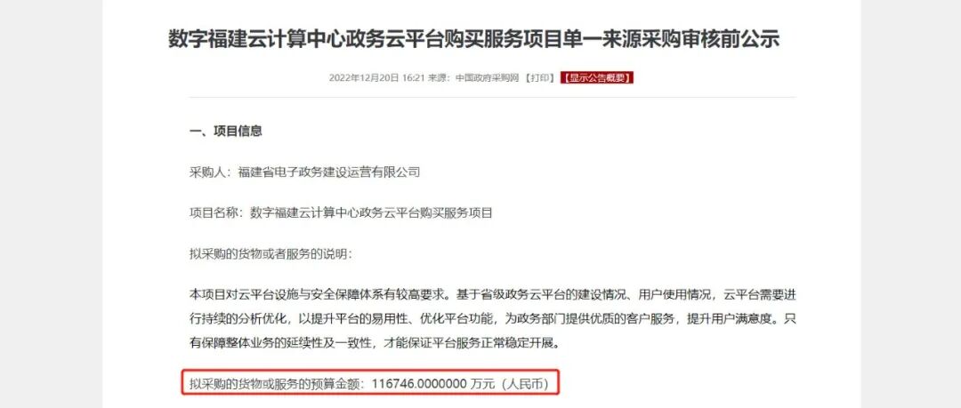 当下,随着泛政府领域数字化转型推进,多个亿元级大额政务云项目出现。数字福建超11亿元的政务云项目有望成为我国2022年度最大的政务云项目。国家队在这类省级政务云大单中充当总集的角色。作为总集,他们往往会从阿里云、华为云、腾讯云等云计算大厂采购服务。比如近期6.08亿元贵州政务云的中标方云上贵州大数据公司,据称背后就有阿里云的支持,而8.96亿元深圳市政务云二期(第一阶段)项目中华为云、腾讯云都是供应商。http://www.ccgp.gov.cn/cggg/dfgg/dylygg/202212/t20221220_19265356.htm![]()