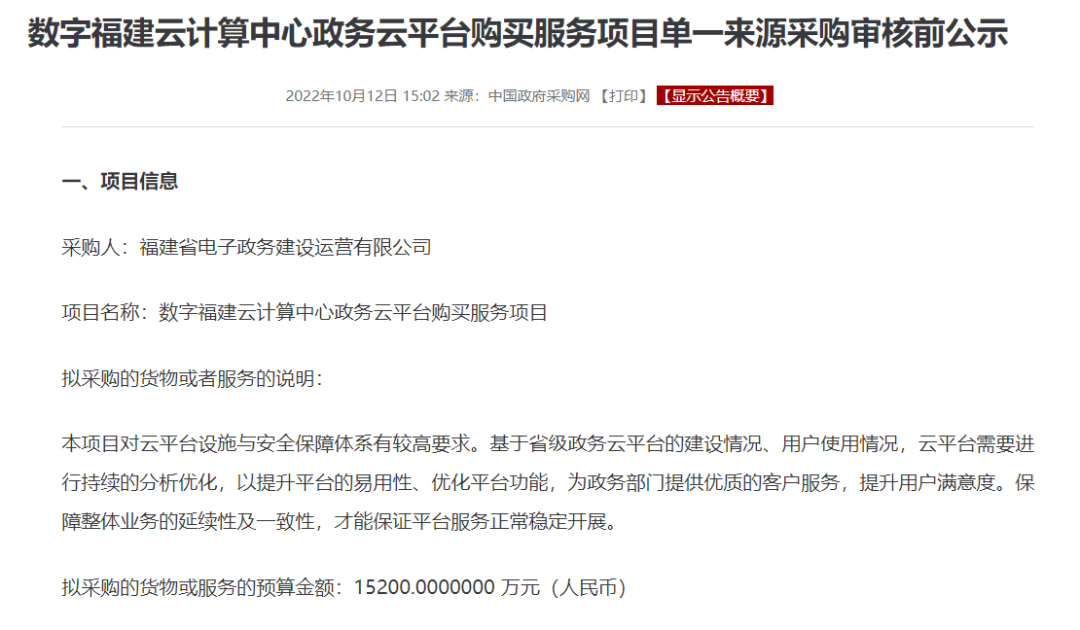 今年10月12日,数字福建云计算中心政务云平台购买服务项目单一来源采购审核前公示,当时,星云公司也是单一采购来源,项目预算15200.0000000万元人民币,约为1.52亿元。![]()