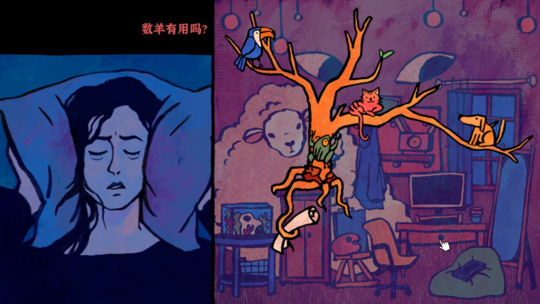 作为一款玩法简单的点击互动解谜游戏,《失眠》的整体流程不长,玩得快的话8个章节不用一个小时就可以打通,而且几乎毫无解密难度。但对无数被失眠困扰的玩家来说,这短短数十分钟却折射出现实世界的自己,以及他们无处言说的精神隐忧。