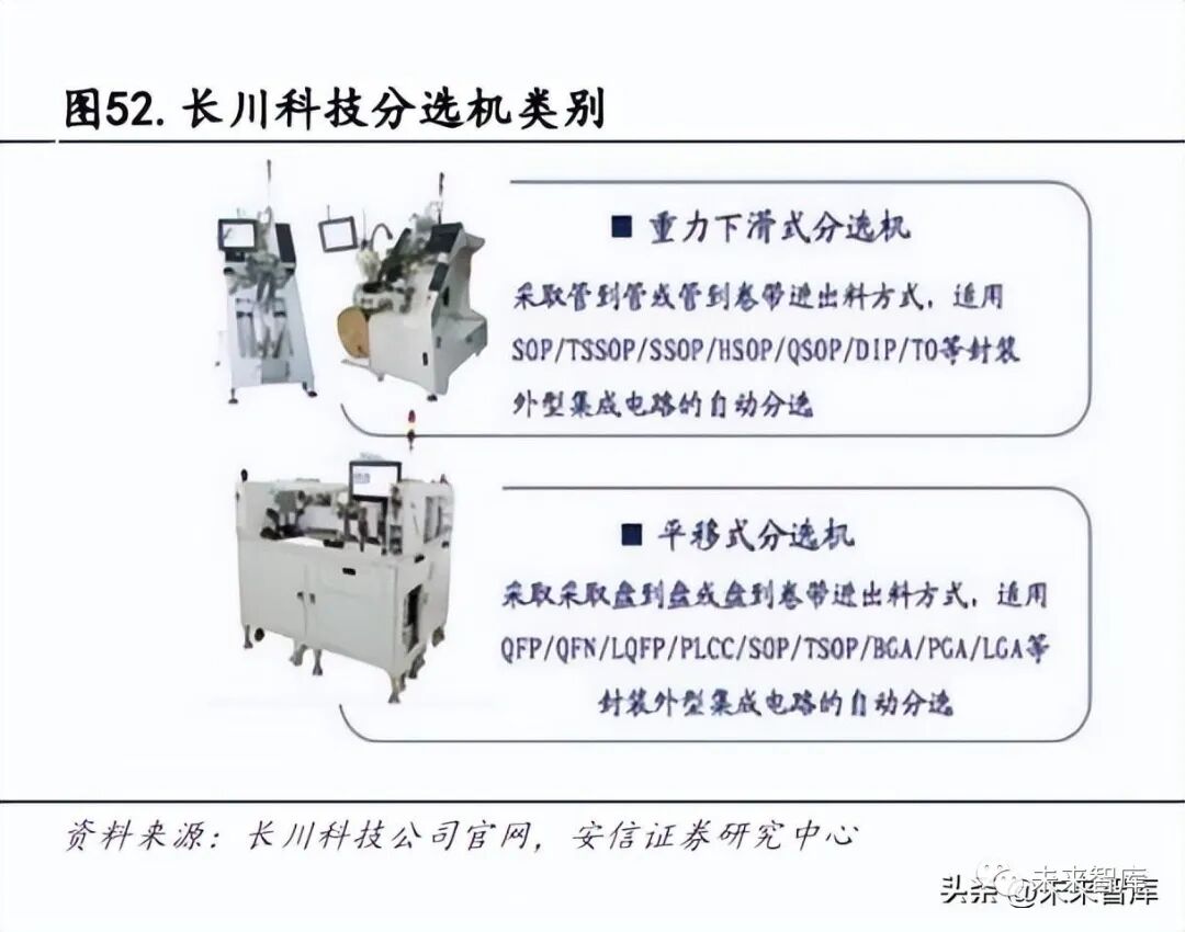 分选机在成品芯片测试环节搭配 ATE 使用,按照形态和适用情形分为重力式、平移式、转 塔式、测编一体机。重力式结构简单,投资小,适合体积较大、测试时间一般的传统类型 封装形式,如 DIP、QFN、SOP 等;平移式采用机械臂运输芯片,适合几乎所有类型的封装, 在测试时间较长或先进封装情况下优势明显;转塔式适合体积小、重量小、测试时间短的 芯片,UPH 最高,许多转塔式结合了视觉检测功能,多以测编一体机的形式存在。测编一体 机将测试(test)、视觉量测(inspection &metrology)、激光打标(mark)、编带等功能结 合为一体,同样也可以分为重力式、平移式、转塔式等类型,由于集成功能较多,因此结 构复杂,技术壁垒较高。