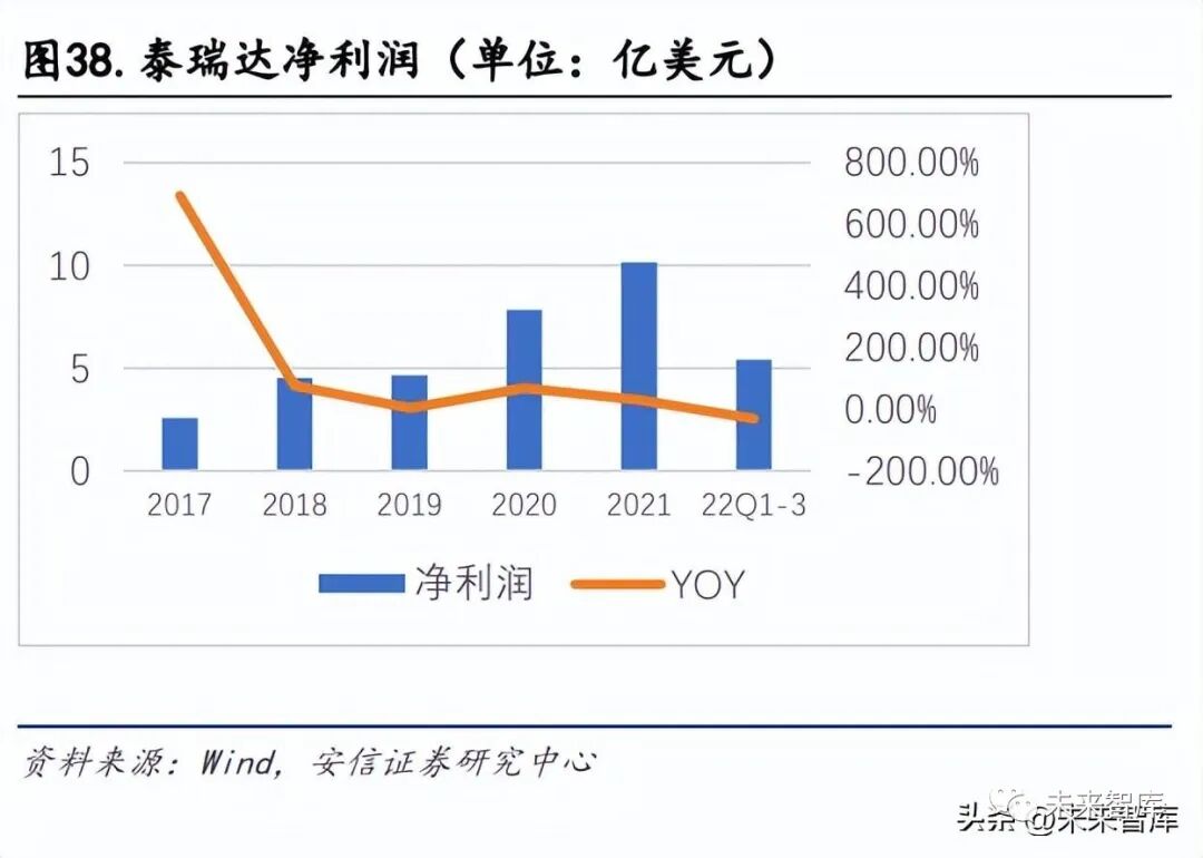 公司下游客户遍布半导体整条产业链,包括世界知名厂商台积电、JA 三井租赁株式会社、 三星电子、Intel、美光、德州仪器、日月光、苹果等,其中台积电、JA 三井租赁株式会社 是近两年来公司最大的客户。从销售地区来看,中国台湾是其销售占比最大的地区,2021 年占比 30%,中国大陆占比从 2016 年的 9.97%增长到 2021 年第三季度的 18%,是最主要的 业绩增长贡献地区。根据公司财报,受半导体行业周期性影响,近四年来公司半导体测试业务营收呈现波动上 升的状态,由 2017 年的 16.63 亿美元增长至 2021 年的 26.42 亿美元,2017-2021 年复合增 长率为 12.27%。2022 年前三季度的营业收入为 24.23 亿美元,同比-14.00%,环比+51.82%;净利润 5.43 亿美元,同比-31.29%,环比+50.83%。主要是供应线限制有所缓解,因此内存 储器件、汽车和工业半导体测试客户的出货量超过预期。其中半导体测试实现营收 15.99 亿 美元,占比 66.00%,较去年占比 55.36%上涨 4.64pct,半导体测试业务不断扩张。