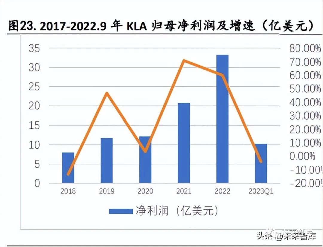 盈利能力稳定,营收持续增长。前道量检测设备具有较高市场准入和技术壁垒,公司的绝 对龙头地位赋予其垄断市场产品定价的能力,保持常年很高的盈利能力。截止 2022 财年,KLA 的营收 92.12 亿美元,同比增长 33.14%,归母净利润为 33.22 亿美元,同比增长 59.83%, 其中半导体工艺控制营收 79.25 亿美元,占总体营收的 86%,是集成电路领域规模最大、覆 盖面最广的量检测公司。2023 年 Q1 季度(2022.6 月-2022.9 月)实现营收 27.24 亿美元,同比+30.74%;实现净利 润 10.26 亿美元,同比-3.97%。公司 23Q1 营收高于预期,主要受供应链改善影响,新产能 得到开出,同时 EUV 掩膜版检测增势强劲,实现了连续增长。按照主营业务结构,2021 年科磊产品和服务收入分别占比 75%和 25%;其中量测业务占比 23%,缺陷检测业务占 77%。多年来科磊的服务收入占比一直维持在 20%的水平,高比例的服 务收入和先进制造商订单,使得公司能够多年来保持稳定的盈利能力。同时公司约 70%的产 品订单来自先进制造商,具备比较稳定的市场需求。