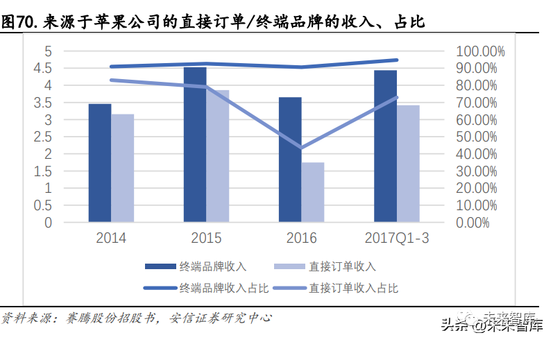公司成立于 2001 年,起家于 3C 自动化设备,主要从事自动化生产设备的研发、设计、生 产、销售及技术服务。2018 年公司购无锡昌鼎电子有限公司 51%的股份,2019 年赛腾股份 拟以现金方式购买 Kemet Japan 株式会社持有的日本 Optima 株式会社 20,258 股股份,占标 的公司股权比例为 67.53%,加码布局半导体设备领域。截至目前,公司主营业务为包括 3C、 半导体、新能源汽车三大部分。公司产品主要应用于苹果及其产业链上的厂商。自 2011 年通过苹果公司合格供应商认证, 公司逐步拓展与苹果的合作领域,建立了长期合作关系, 2014 年-2017 年,苹果连续 4 年 成为公司销售收入占比最高的下游客户。其中 2017 年 Q1-Q3 苹果直接订单收入达到了公司 总订单收入的 73%,公司应用于苹果公司终端品牌产品生产实现的收入维持在 90%以上。