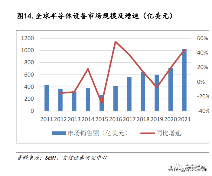 根据 SEMI 的统计,2020 年全球半导体设备市场规模约 712 亿美元,同比增长 19.2%,其 中前中道晶圆制造设备 613 亿美元,占比 86.1%;后道封装测试设备市场规模约为 98.6亿美元,占比约 14%, 在所有地区均显示强劲增长,其中封装设备 38.5 亿美元,后道测 试设备 60.1 亿美元。受消费电子、PC 等下游景气度提升和 5G、AI、云计算等新应用拓展,全球半导体需求整体 向好,半导体厂商资本开支进入新一轮上升周期,半导体设备市场规模随之提升,2021 年 全球半导体设备市场销售额达 1,026 亿美元,同比增长 44.1%,其中前道晶圆制造设备 880 亿美元,后道测试设备 78 亿美元,后道封装设备 70 亿美元。分地区来看,2021 年中国大陆半导体设备市场达 296 亿美元,同比增长 58%,占全球市场 比 29%,第二次成为全球最大半导体设备销售市场,近年来全球半导体产业链呈向中国大陆 转移趋势,中国半导体设备市场国产替代进程明显。