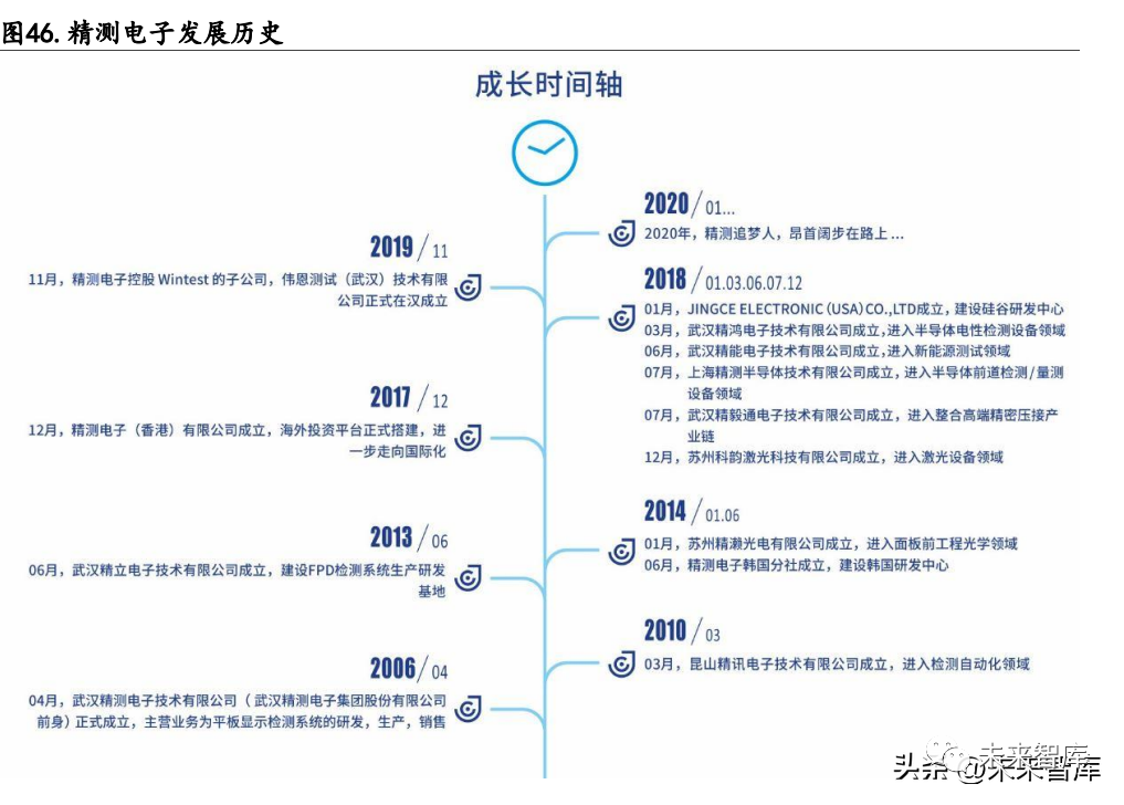 武汉精测电子集团创立于 2006 年,是国内面板检测系统龙头企业。公司起家于 Module 段 电讯技术信号检测,经过多年的发展,公司目前 Module 制程检测系统的产品技术已处于行 业领先水平,是国内面板 module 段领军企业,并开始向前端 Array 制程和 Cell 制程延 伸,在 2014 年引进了宏濑光电和光达检测科技有限公司关于 AOI 光学检测系统和平板显 示自动化设备相关的专利等知识产权后,开始构建自身的自动化检测及 AOI 体系,并完成 了相应产品开发。公司目前已经成为行业内少数在基于机器视觉的光学检测、自动化控制,和基于电讯技术的信号检测等方面均具有较高技术水平的企业,具有“光、机、电、算、 软”一体化的整体方案解决能力。