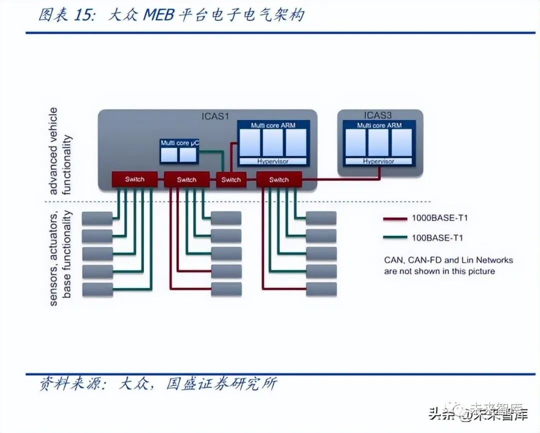 目前,主流量产车型基本遵循博世 E/E 架构路线,由分布式向域集中式过渡,推进 “功能域”控制器集成。主流车企量产车型正在从分布式架构向“功能域”集中架构演 进,实现博世五域中全部或部分域的集成,例如大众 MEB 平台。新势力车企和部分传 统车企已经实现域集中式架构车型的搭载和量产。新势力、头部自主率先进入域集中电 子电气架构阶段,合资、外资车企陆续发展出域集中架构车辆。