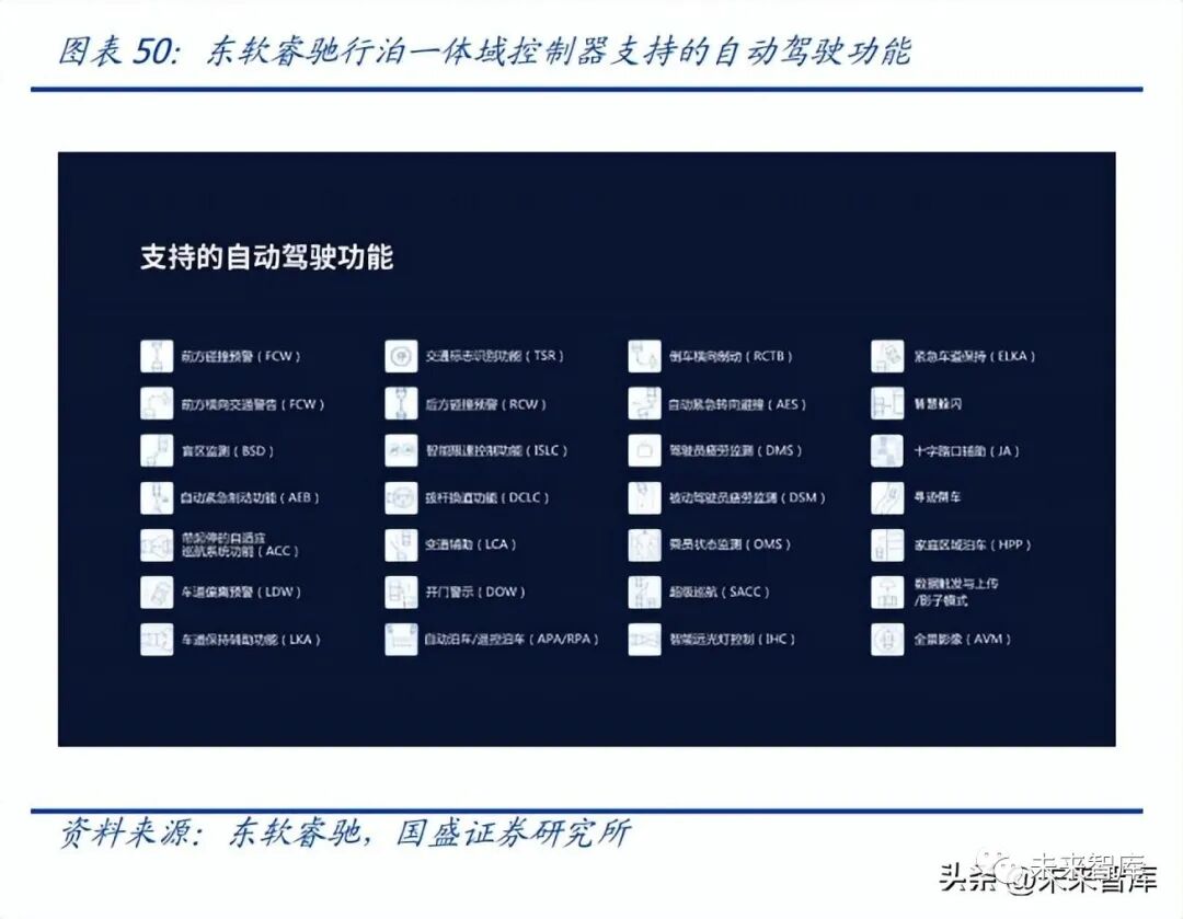 动力域用于动力总成的优化与控制,同时兼具电气智能故障诊断、智能节电、总线通 信等功能。动力域控制器是一种智能化的动力总成管理单元,借助 CAN/FLEXRAY 实现 变速器管理,引整管理电池监控交流发电机调节。其优势在于为多种动力系统单元(内 燃机、电动机发电机、电池、变速箱)计算和分配扭矩、通过预判驾驶策略实现 CO2 减排、通信网关等,主要用于动力总成的优化与控制,同时兼具电气智能故障诊断、智 能节电、总线通信等功能。底盘域将集成整车制动、转向、悬架等车辆横向、纵向、垂向相关的控制功能,实现 一体化控制。传动系统负责把发动机的动力传给驱动轮,可以分为机械式、液力式和电 力等;行驶系统把汽车各个部分连成一个整体并对全车起支承作用;转向系统保证汽车 能按驾驶员的意愿进行直线或转向行驶;制动系统迫使路面在汽车车轮上施加一定的与 汽车行驶方向相反的外力,对汽车进行一定程度的强制制动,其功能是减速停车、驻车 制动。底盘域可在传动系统、行驶系统以及制动系统中集成多种功能,较为常见的有空 气弹簧的控制、悬架阻尼器的控制、后轮转向功能、电子稳定杆功能、转向柱位置控制 功能等。若提前预留足够的算力,底盘域将集成整车制动、转向、悬架等车辆横向、纵 向、垂向相关的控制功能,实现一体化控制。实现底盘域的功能,需要实现底盘域驱动、 制动和转向算法的集成。