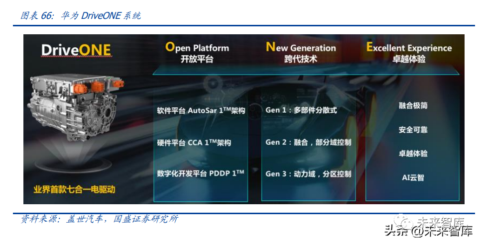 近年来,国内厂商在动力域控制器陆续获得突破,其中华为、合众汽车在量产能力、 技术水平上领跑。合众汽车是国内首家动力域控制器进入量产阶段的新创车企,其研发的 PDCS 域控制 器于 2020 年通过了搭载车辆测试,开始量产并搭载于哪吒汽车。该域控制器采用英飞 凌(Infineon)多核处理器,集成 VCU、BMS、MCU(微控制单元)以及 L2 自动驾驶功 能;按照 ASIL C 功能安全等级开发,有效保证用户出行安全,兼具 AUTOSAR 架构和 MBD 建模与控制,有效提高软件可靠性;可实时监控电控系统,智能协调及监控动力 输出,提升驾控性能及安全;同时保护电池安全,根据系统需求,同步优化能量分配、 增加续航里程。未来依托硬件迭代可实现更多功能,如复杂算法,更高级别的控制策略, 驾驶习惯自学习,习惯路线模拟与低能耗规划,无感知 OTA 等。