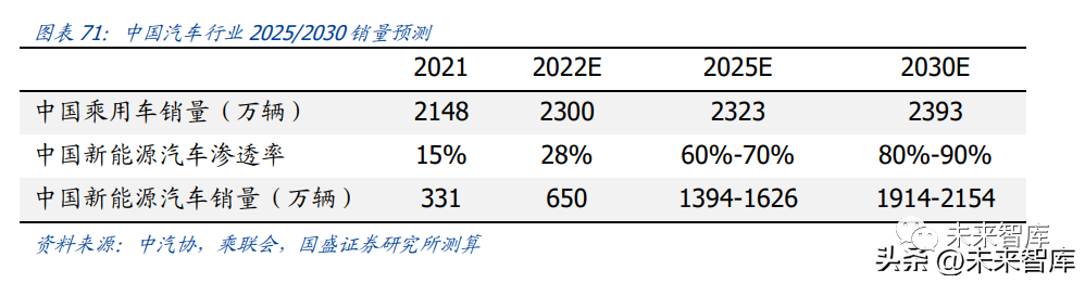 当前,中国乘用车预计总量趋于平稳,2025/2030 年将达到 2323/2393 万辆。国内新能 源汽车渗透率将迎来快速提升:2022 年国内新能源车销量有望达到 650 万辆;预计 2025 年中国新能源汽车销量将达到 1394-1626 万辆,渗透率达到 60%-70%;2030 年 或将达到1914-2154万辆,渗透率突破80%。结合预测区间中位数,将根据2025/2030 年新能源汽车销量 1500/2100 万辆进行后续计算。