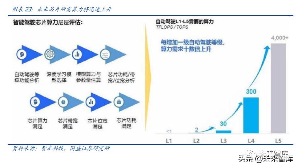 全球图形处理芯片、自动驾驶芯片巨头英伟达,目前是车企 L2+以上自动驾驶领域的 主要芯片供应商。目前英伟达占据了自动驾驶芯片领域 30%以上的市场份额,主要集 中在 L3 级自动驾驶。英伟达的 Orin 芯片是目前技术最为成熟的自动驾驶域控制器芯片, 在 L2+以上的自动驾驶领域具有较大的技术优势,国内政策厂要进行 L3 与 L4 级别的自 动驾驶的开发基本只能选择英伟达的芯片。2021 年 4 月英伟达发布了下一代芯片 Atlan, 单芯片算力达 1000TOPS,预计 2023 年向开发者提供样品,2025 年大量装车。2022 年 9 月,英伟达正式发布了下一代 SoC 芯片 Thor,计划于 2024 年量产,2025 年上车,此 前发布的 Atlan 芯片将不再上市。Thor 单片算力能够达到 2000TOPS,达到了现款产品 Orin 近 8 倍,同时也是单颗 FSD 芯片的 28 倍。极氪已宣布将搭载 Thor,应用于下一代 智能电动汽车,并于 2025 年初开始生产。