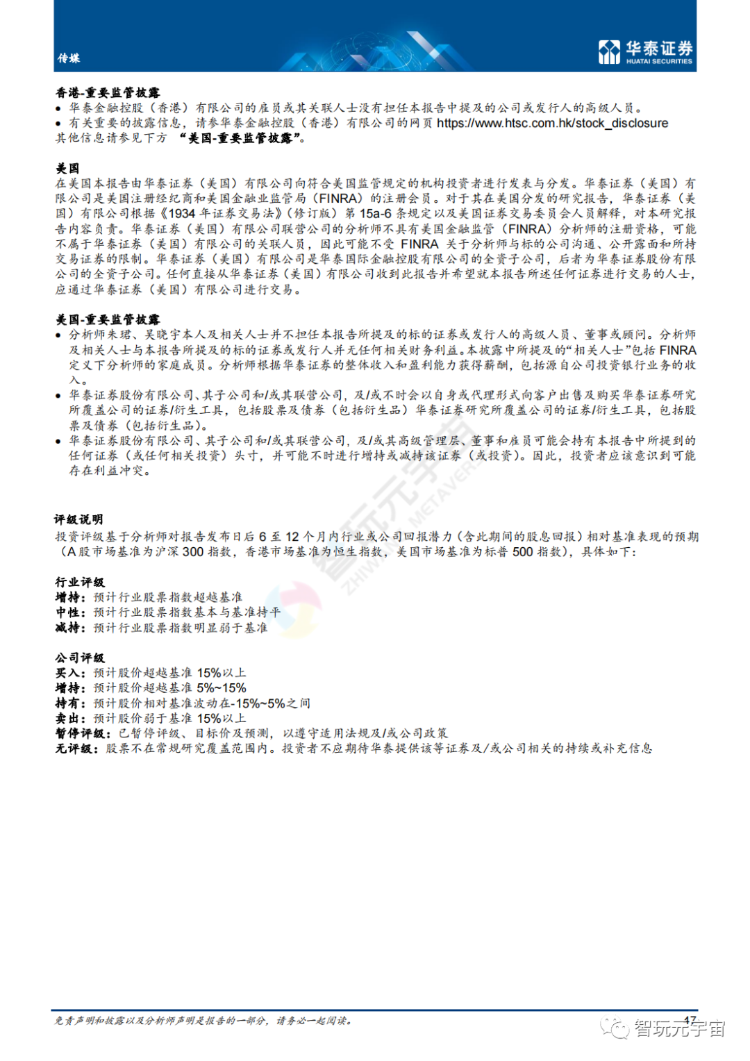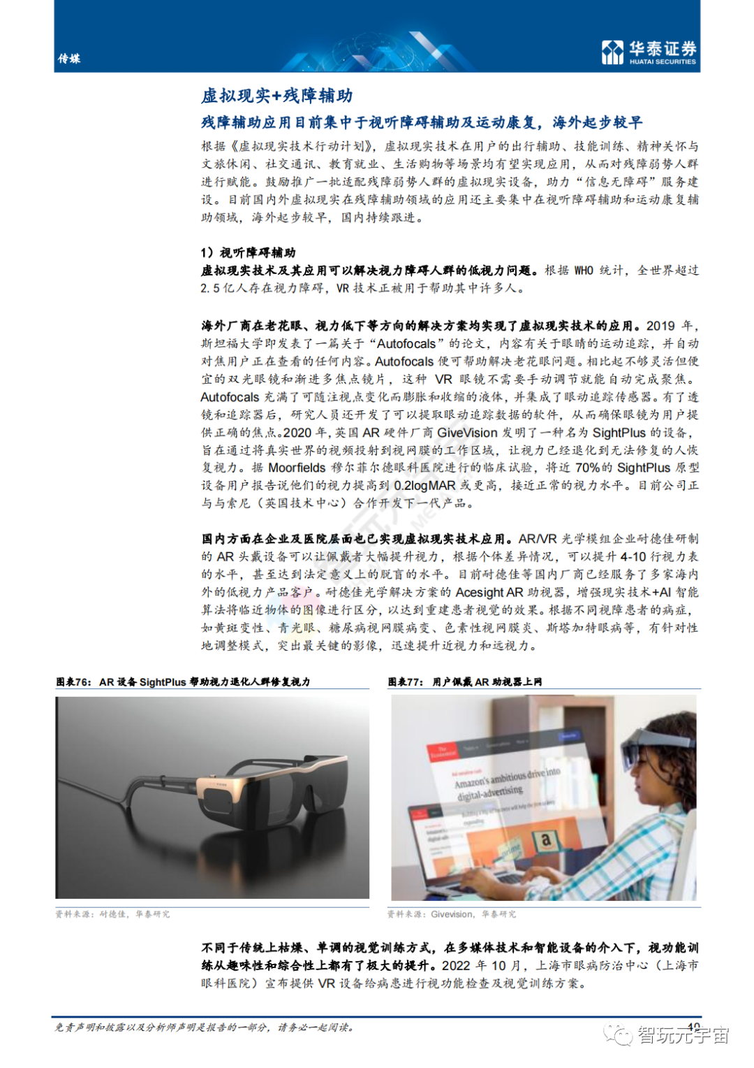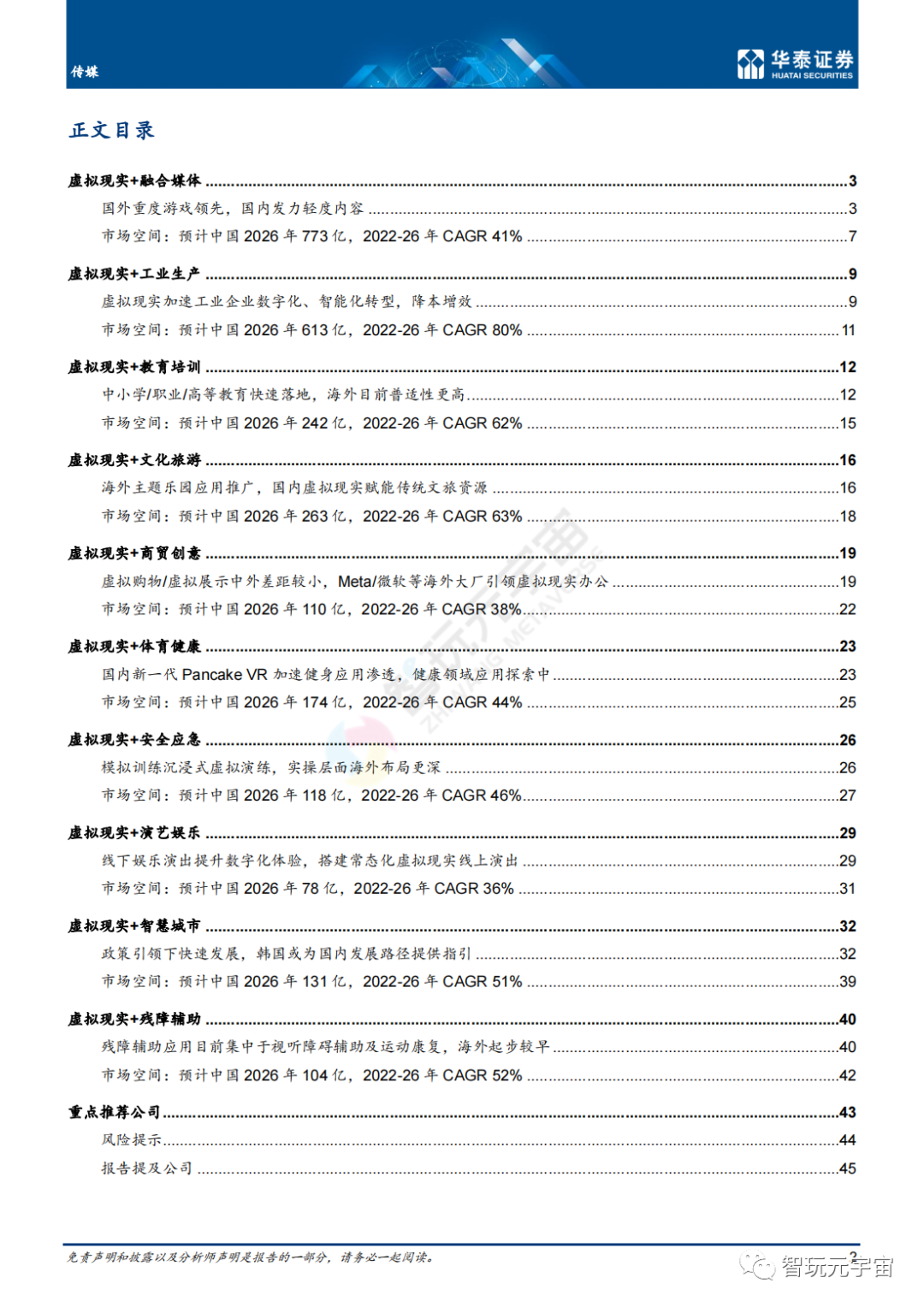 国内加速布局虚拟现实轻度融合媒体内容;工业元宇宙加快落地我们预计 2026 年中国虚拟现实+融合媒体空间为 773 亿元。目前重度内容主要由海外公司打造,受用户消费习惯与能力的制约,我们认为短期内轻度内容(休闲游戏、视频)是国内厂商实现弯道超车的关键,PICO 等头部平台在 VR 直播、健身、社交等场景加快布局力度。我们预计 2026 年中国虚拟现实+工业生产市场空间为 613 亿元,虚拟现实技术加速工业企业数字化、智能化转型,打破物理空间限制。海外微软等头部企业通过软硬件一体方式与客户企业深度合作打造个性化解决方案,降本增效效果显现;国内正在快速发展中。标的推荐:宝通科技、芒果超媒、三人行、蓝色光标、昆仑万维。虚拟现实+中小学/职业/高等教育快速发展;赋能文旅内容数字化我们测算 2026 年中国虚拟现实+教育培训规模 242 亿元,中国相比于海外起步更晚。具体来看,中小学教育方面,国外普适性更强,对于特殊群体关注度更高;职业教育方面,国内外均注重搭建虚拟仿真实训基地,解决“三高三难”(高投入、高损耗、高风险;难实施、难观摩、难再现)问题;高等教育方面,国外在学生的软技能培养上相对领先。我们预计至 2026 年中国虚拟现实+文化旅游市场规模达 263 亿元。海外主题公园及乐园场景VR/AR 应用较为领先,国内政策支持虚拟现实+文旅应用落地,虚拟现实技术赋能传统文旅,给予观众沉浸式体验。布局虚拟购物/展示,办公方兴未艾;虚拟健身大力渗透&健康诊疗逐步探索我们测算 2026 年中国虚拟现实+商贸创意规模 110 亿元。虚拟购物/虚拟展示门槛较低发展更快,国内外在商业模式上差距不大;而办公在 Meta、微软等国外大厂的引领下快速发展,海外以 MR 为主,用户拥有虚拟 Avatar并与现实环境融合,沉浸感/交互性更强,国内以 AR 为主。我们预计至 2026年中国虚拟现实+体育健康应用市场规模达 174 亿元。海外较早开始进行 VR体育健身领域探索,新一代 Pancake 产品发布后,以 Pico 为代表的头部国内 VR 企业加快推进运动领域的应用;虚拟现实技术在健康领域的应用如医学教育、临床诊治等逐步拓展,但目前仍处于较早期。虚拟现实应用于多样化安全应急场景,全面赋能演艺娱乐我们测算 2026 年中国虚拟现实+安全应急市场规模 118 亿元。我们认为虚拟现实+安全应急主要包括训练和实操,模拟训练方面,国内外布局场景类似,主要用于高危、高成本消耗行业与自然灾害防治;实际操作方面,部分中国企业与警务合作,国外军用相关采购力度更大(Hololens)。我们预计2026 年中国虚拟现实+演艺娱乐市场空间为 78 亿元。海外虚拟演出发展较为成熟,主流服务商较早开始举办虚拟演出活动;国内虚拟演出平台已上线,且线下演出也基于 VR/XR 新技术赋能,共同为用户带来身临其境的体验。虚拟现实政策引领下助力智慧城市发展,发挥视听障碍辅助及运动康复作用我们测算 2026 年中国虚拟现实+智慧城市市场规模 131 亿元。海外路径更明确,其中韩国首尔政府在经济/教育/旅游/信访/城市/行政与基础设施 7 大领域铺开元宇宙应用。国内政府政策陆续出台加快发展,探索虚拟现实在城市治理中的融合应用,形成城市可视化管理解决方案。我们预计 2026 年中国虚拟现实+残障辅助市场空间或达 104 亿元,目前国内外虚拟现实在残障辅助领域的应用主要集中在视力障碍辅助和运动康复,海外起步较早,国内政策鼓励推广适配残障弱势人群的虚拟现实设备,已有龙头公司推出标杆产品,助力“信息无障碍”服务。![]()
