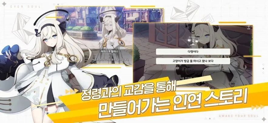 首先自然就是清新感。如同此前紫龙在韩国市场一度登顶iOS畅销榜的《Archeland》,《永恒灵魂》基于同样的JRPG设定也推出了一位大面积采用白色元素的看板娘梅菲斯托佩莱斯。且不论这个角色的命名和造型是否具有辨识度,大面积的白和由此带来的区别于传统韩式MMO油腻性感的美少女画风,已经足以让韩国二次元玩家们一见倾心。