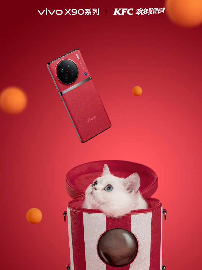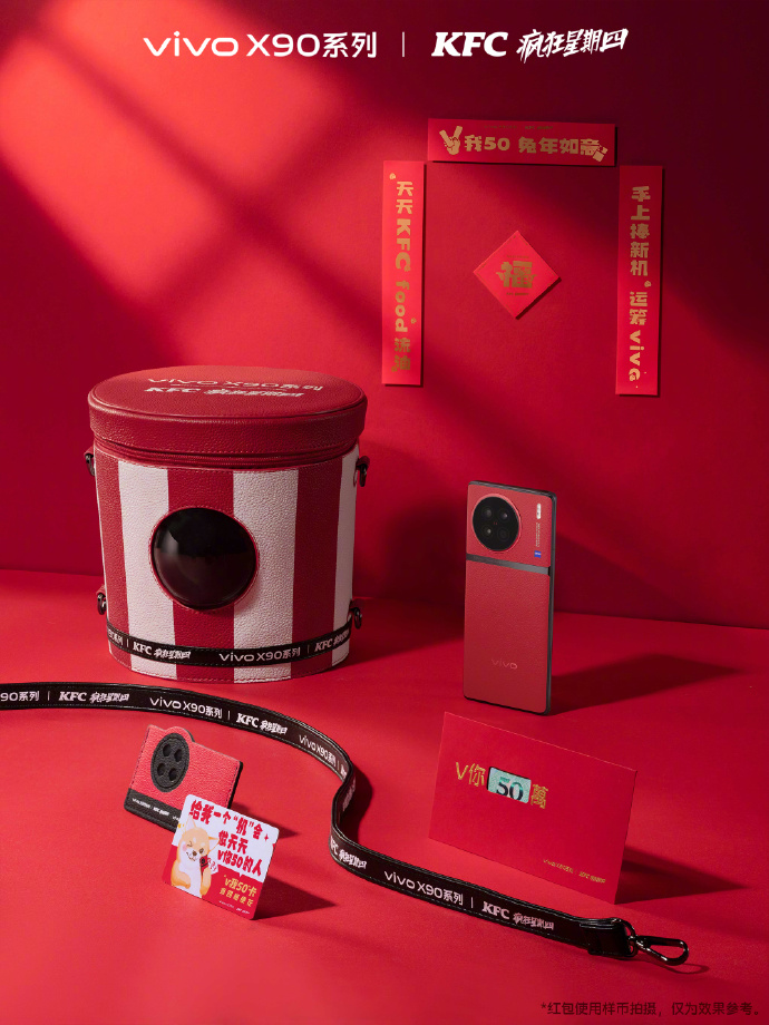 近年来,肯德基推出了疯狂星期四活动,吸引了不少消费者关注,并且由此衍生了网络热梗——v我50,随着流传较广,不少网友发现,”v我50“读起来很像”vivo 50“,所以不少网友便直接采用更简便的vivo读法,就在今日,网络热梗将成为现实。今日,vivo宣布与肯德基合作,推出vivo X90的“v我50”联名礼盒,将于明日“疯狂星期四”上线。从图中可以看到,该礼盒的外包装采用了肯德基全家桶的造型,并且根据官方宣传应该是个猫包,礼盒包含vivo X90华夏红手机、肯德基全家桶猫包、卡包、50元红包、福字对联。据vivo官方介绍,1月12日当天,上电商平台搜索“v我50”,或上vivo官网App等平台参加活动,线下官方授权体验店购买vivo X90系列,就有机会获得一年疯狂星期四免费吃、“v我50”联名礼盒等好礼。据之前报道介绍,vivo X90系列采用New Choker缎带云阶、手术级不锈钢Halo环设计,并提供荔枝纹皮革的华夏红、皮质的原黑、萤石AG玻璃材质的冰蓝和至黑四款配色可选,此次礼盒中就是华夏红配色。性能方面,新机搭载天玑9200,跑分达128W,整体功耗比天玑9000降低25%以上。此外,vivo与MediaTek深度联合研发MCQ多循环队列、AIxModem感知&搜网AI引擎、APU深度优化、MAGT自适应画质模式、智能降蓝光等芯片技术,并且还搭载了自研的V2芯片。影像方面,vivo X90每颗摄像头都继续使用蔡司T*光学镜头,搭载5000万像素的VCS仿生光谱大底主摄,降噪和色彩还原能力皆有提升。电池方面,vivo X90内置4810mAh电池,支持120W双芯闪充,标配120W迷你充电器,超快模式下8分钟至快可充电至50%。售价方面,8GB +128GB版本3699元、8GB+256GB版本3999元、12GB+256GB版本4499元、12GB+512GB版本4999元,但具体礼盒的售价还暂未得知,感兴趣的消费者可以明天关注一下。