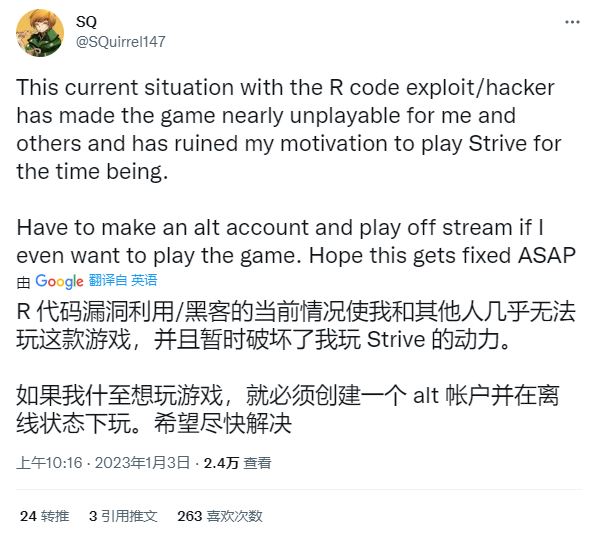面对玩家们越烧越旺的怒火,GGST制作人Zack于1月5日发推:“回到办公室。浏览所有报告中。”暗示团队已经意识到了漏洞存在。然而至本文截稿前,官方尚未推出任何修复补丁,黑客的攻击也仍在继续。