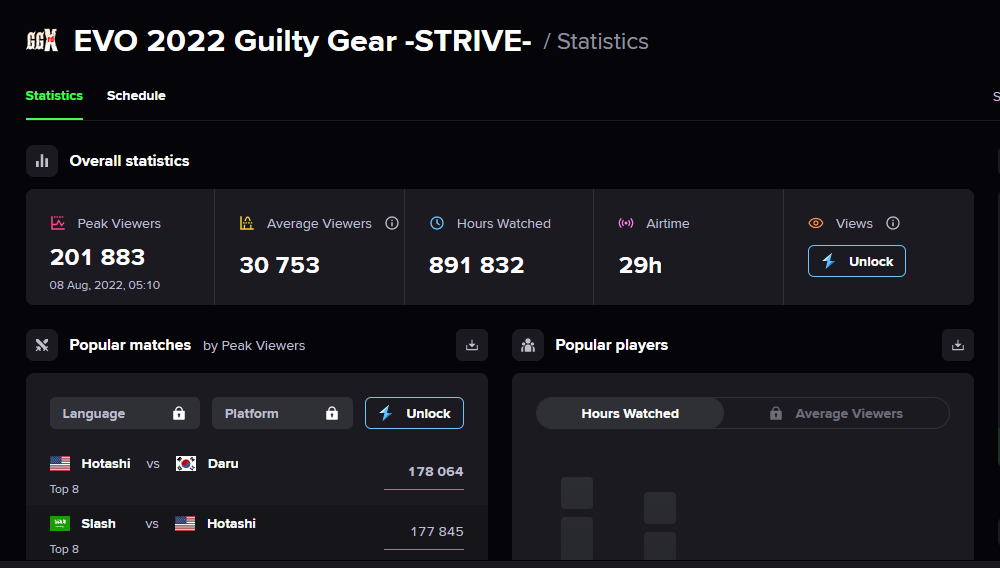 不过和其他的格斗游戏一样,GGST的推广离不开直播和视频。尤其是萌新,他们会翻找大佬的直播和录像,从中学习各个角色的连招和策略来精进自身。仅在Twitch上,EVO 2022的GGST项目就吸引了近20万名观众同时收看。