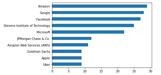 df['company'].value_counts().head(10).plot(kind="barh").invert_yaxis()