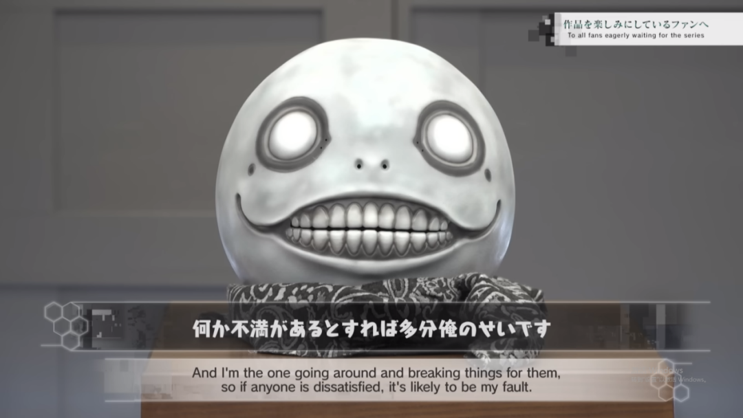 横尾太郎是自由的。在曾经为《尼尔:伪装者》的复刻版命名时,他就因为认为游戏的改动程度不够,连“1.5版”都算不上,而将它命名为《尼尔:人工生命ver.1.22474487139...》。而“1.22474487139...”,是他将1.5开根后的数字再加上随意的运算得到的结果,以此来表示对《尼尔:人工生命ver.1.22474487139...》的不满。