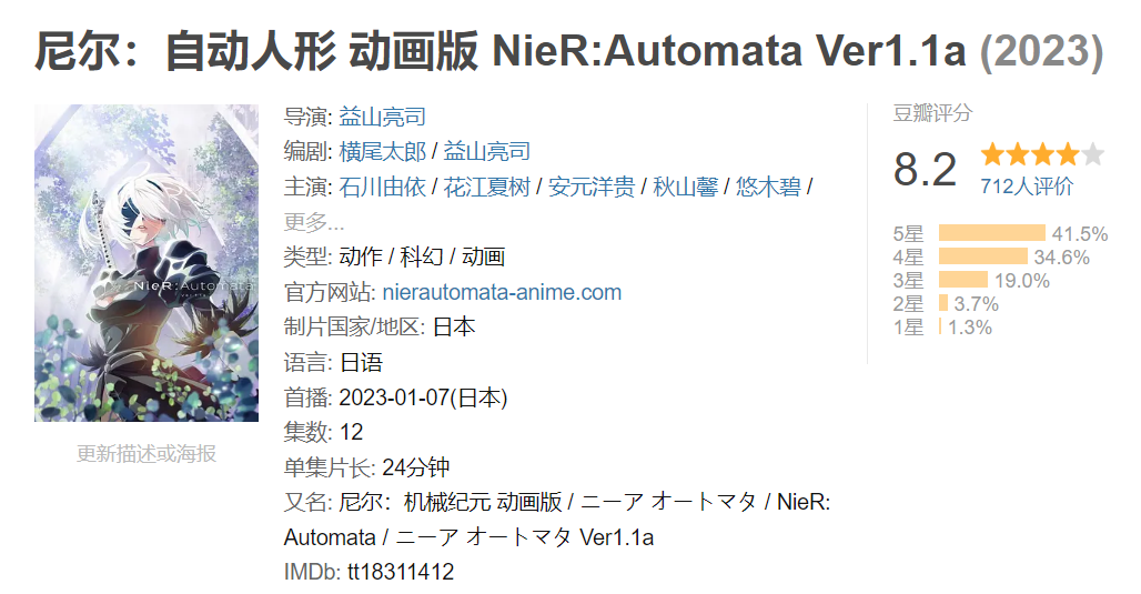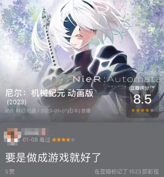 大量高还原度的优秀的场景,忠实于原作的剧情设置,加上可圈可点的作画水平,都使得《尼尔:机械纪元Ver1.1a》在目前获得了不错的口碑。在豆瓣上,它也取得了8.2分的好成绩。