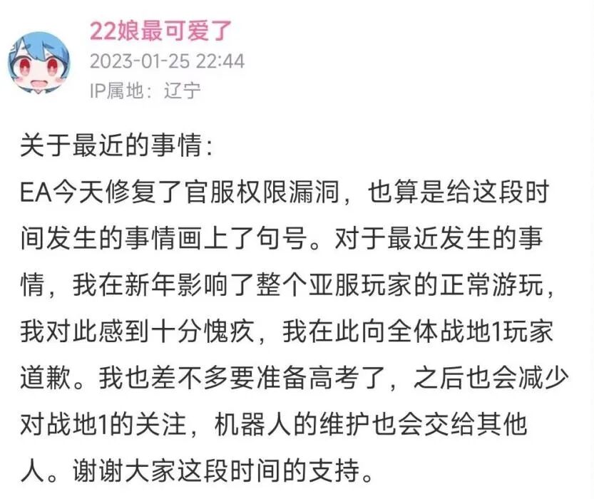 尘埃落定的半夜时分,22在B站动态发布了一则公开声明,向自己所影响到的亚服玩家道歉,并表示要准备高考,减少对《战地1》的关注。
