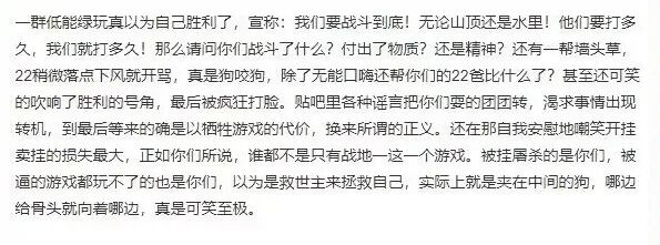 而另一边的外挂团体正相反,开战后就从未停下舆论攻势,如今则加速动摇了绿色玩家的信心。即便取得了技术优势,他们还在高调宣传外挂必胜的言论,大肆嘲讽绿玩的分裂现状——不如说,正是那些令任何一名绿色玩家都有可能感到生理不适的言辞,比“赛博一战”本身先火出了圈。