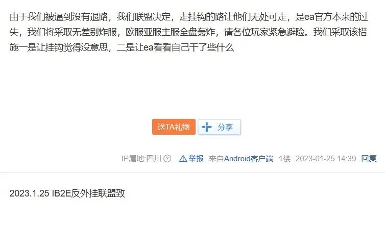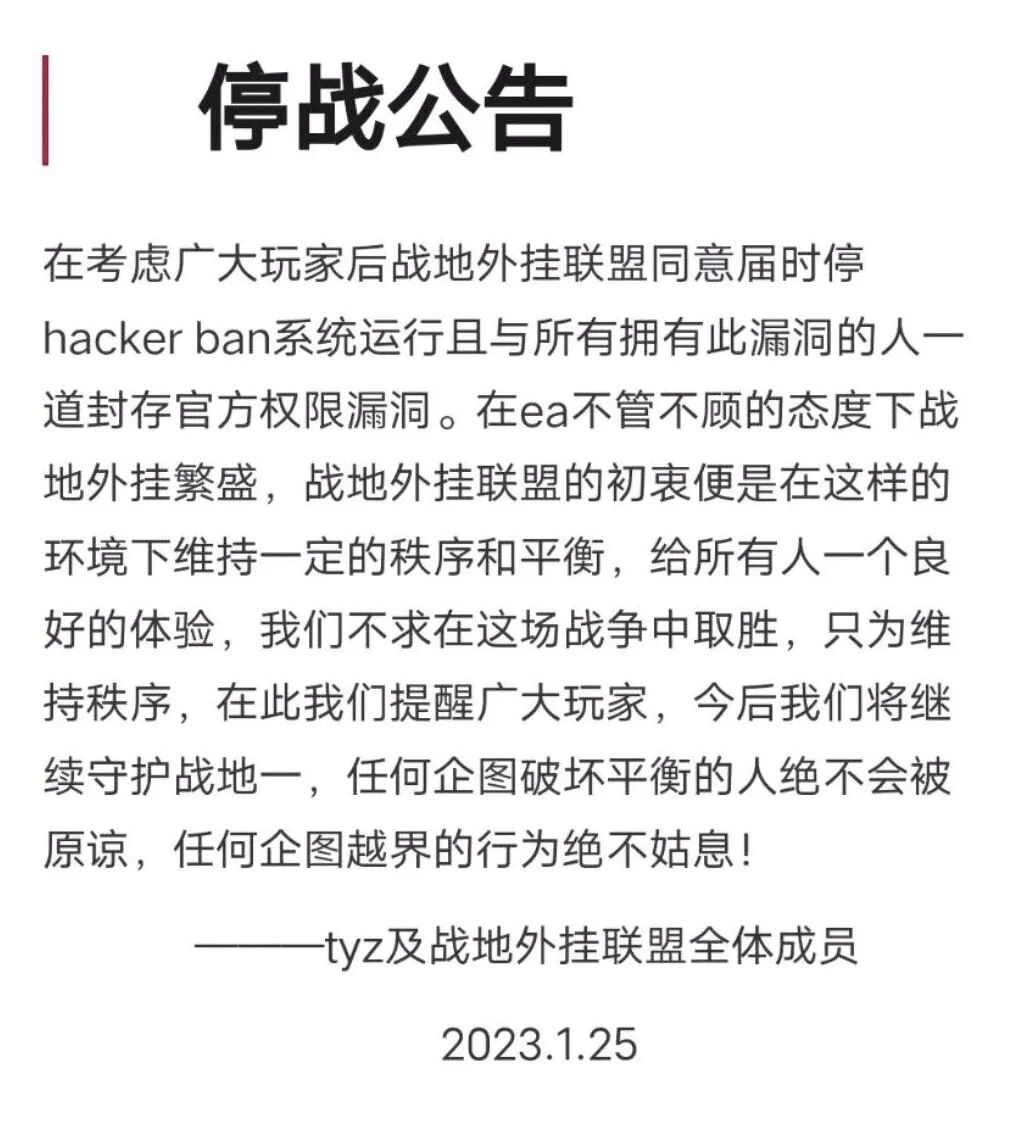 这两天,外挂团体依旧没有停止舆论攻势。EA社区经理回复后,他们发布了一则单方面的“停战公告”,称自己“考虑广大玩家”才停用权限,并“与所有拥有此漏洞的人一道封存官方权限漏洞”。