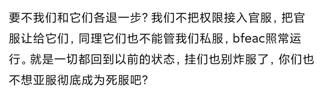 此前被主战派盖过风头的种种声音也大了起来:有人期冀于向外挂妥协,恢复曾经的官私平衡;有人批驳22的动机,怀疑他拿玩家当枪使;还有人抱怨BFEAC,而非外挂,毁掉了整个游戏……