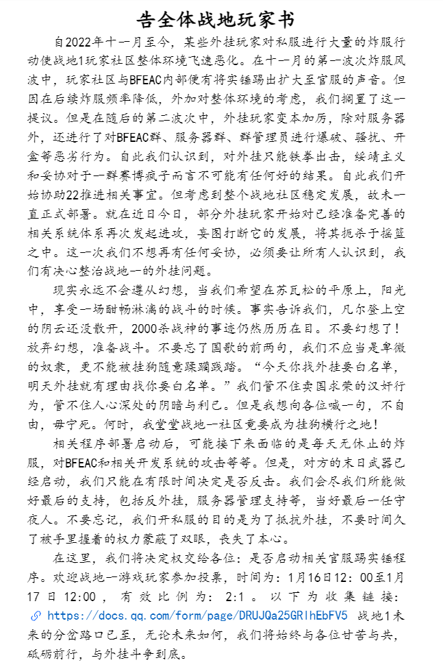 1月16日中午12点,BFEAC发布了《告战地全体玩家书》,呼吁绿色玩家“放弃幻想,准备战斗”;同时公布了一份需要输入EA帐户才能参与的民意投票调查问卷,将EAC接入官服的决定权下放给全体玩家和私服管理员。