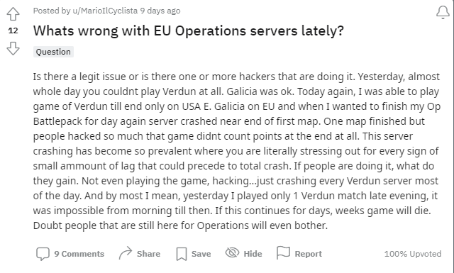 某个能够获取官方权限、踢出外挂玩家的服务器漏洞遭到扩散,令冲突上升到了白热化的地步。在冲突烈度最高的春节期间,《战地1》PC端服务器遭到多种方式轰炸而瘫痪,亚服玩家无法进入游戏,只能勉强进入部分欧洲服务器避难。