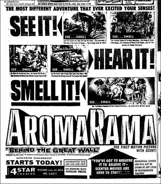 里德跟托德叫板的资本,是自家公关主管查尔斯·韦斯(Charles Weiss)花了两年半时间发明的“AromaRama”(芳香全景)系统。这个名字影射了1952年首次出现的全景电影(Cinerama),就和“Smell-O-Vision”一样,把自己比作某种革新。