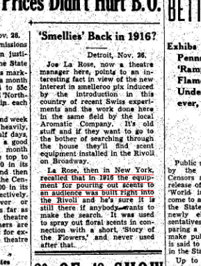 据美国《综艺》(Variety)杂志记载,在1916年有一部叫做《花的故事》的短片上映。为了整点“花”活,纽约里沃利(Rivoli)剧院特地准备了一种向观众喷洒香水的设备,但在放映结束后就再没使用过。