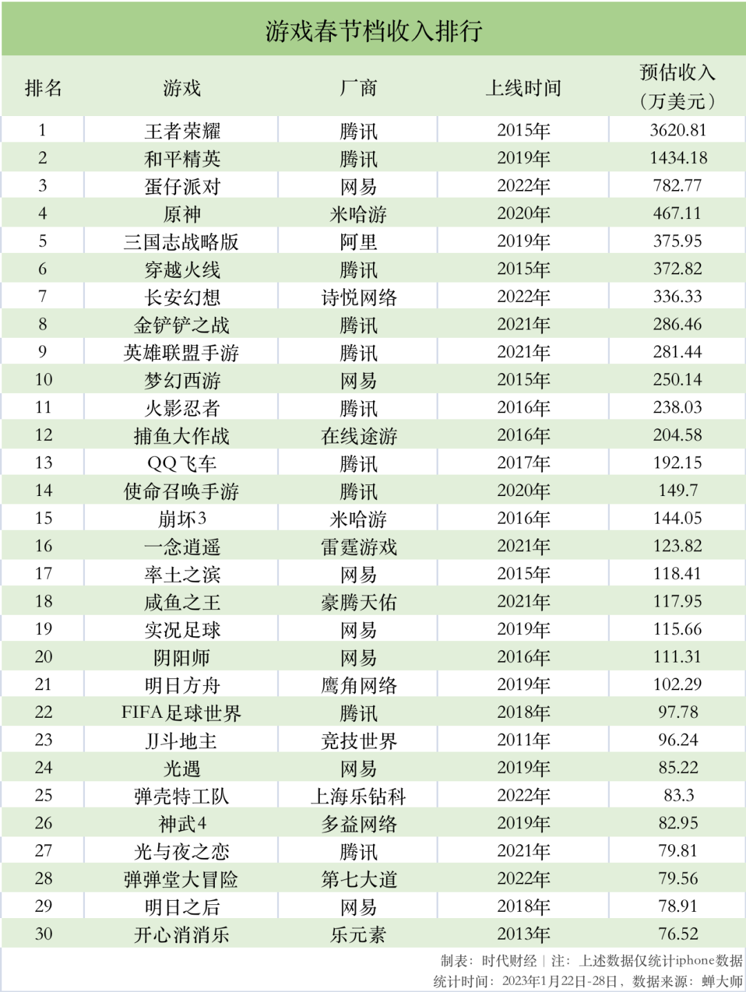 注重宅家团聚、合家欢的春节档,通常是游戏行业吸金的大好机会。近日,根据时代财经梳理第三方数据所得的《游戏春节档收入排行Top30》,今年《王者荣耀》再以3620.81万美元预估营收(约合人民币2.4亿元)蝉联榜首。