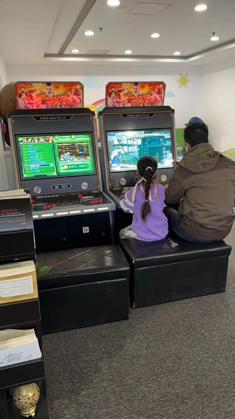看到一幕温馨场面,爸爸和丫头一起打街机。