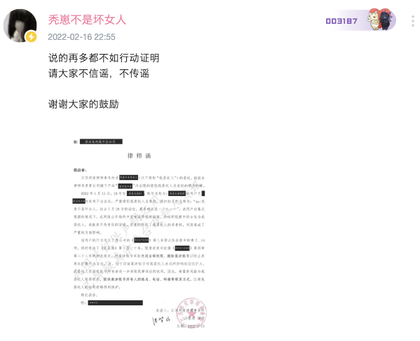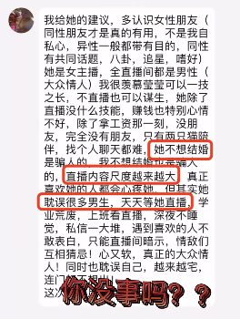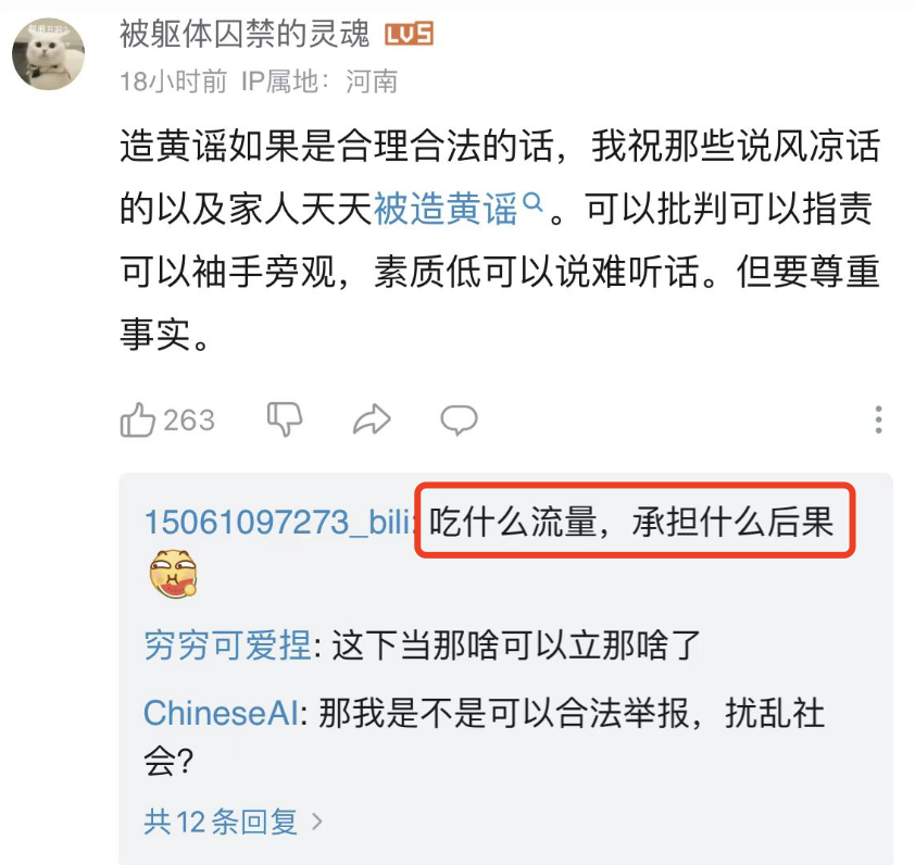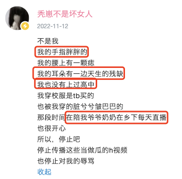 就这样直播了一年多时间,秃崽逐渐积攒了不小的人气,抖音和B站都有不少拥趸,粉丝群也逐渐活跃了起来。然而事实并非完全一帆风顺。去年3月28日,秃崽自己上传的一条视频,打破了“擦边”的平静。自从2021年开始,有一位男性观众对秃崽产生了超越常理的依恋,开始频繁对她大量骚扰私信。秃崽最早也是一拉黑了之,然而没想到这人不依不饶,继续换号、继续大量私信;秃崽连续拉黑多个账号置之不理,这人不知通过什么手段找到了秃崽的闺蜜,继续自说自话的骚扰;诸多秃崽的粉丝,也莫名其妙受到了骚扰私信。但在对方脑补里,秃崽似乎已经将他当做了唯一的依靠和精神支柱,他是来拯救秃崽的。对于秃崽的直播他也有很多意见,不允许秃崽穿大尺度装扮,不允许她与其他男粉丝交流。持续不断骚扰得不到回应,这人还进一步升级,捏造秃崽谣言,说她寄炸弹害他。又在去年下半年,某境外成人网站博主上传了一条视频,片中女主角被很多观众“认为”是女主播秃崽。一时间谣言四起:二次元女主播秃崽下海了、视频里装的高冷我早知道你干这个、为了流量脸都不要了……那段时间,秃崽一上传新视频,评论和弹幕里就有很多:已阅、已阅、已阅。秃崽一开直播,弹幕和SC也有很多:已阅、已阅、已阅。茶余饭后,观众们肆无忌惮的诋毁着秃崽。故事越传越离谱,一些甚至流传到秃崽父母耳边,秃崽因此被怒骂放荡、下贱。即便她是当时唯一在给家里挣钱的人。忍无可忍之下,她不得不再站出来辟谣:相关的对比证据也被陆续放出,在多个视频平台置顶发布:然而,真正去传播这些谣言的人,大多本就不在乎那是不是事实。此刻的秃崽,距离被迫「退网」,倒数还剩2.5个月。有关秃崽的黄色谣言,虽然在视频事件中被吵的较凶,但相似的谣言至少在1年前就已经普遍存在了。