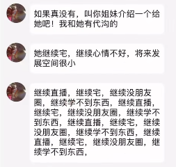 秃崽尝试了警告、发公告、递律师函,但这些行为并没有产生什么实际的用处。与此同时,得益于互联网的匿名属性,越来越多所谓的乐子人、LSP加入了“胆大妄为”的行列。虽然秃崽对此从不惯着,各种发癫的抽象人都挂出来鞭尸。但依旧有很多人乐此不疲。这其中,有每天早晚各一次来叫妈的;上来就汪汪叫要当狗的;有求着主播来支配他,抱着腿喊主人;多少是整活的,多少是真发病,我不好说。放眼整个互联网,这些言语也算是相当炸裂。然而更可怕的是,即便这些言论,也还是相对“温柔”的。自从去年10月末开始,或是受到了视频传播的影响,秃崽收到的私信烈度明显上了个台阶。以往不少人虽然也对她说着些怪话,但自此之后更直白、更强烈的关键词出现在了私信中,数量越来越多,渐渐地,举报都举报不过来。潜移默化间,在主播自己都没注意到的时候,她与观众的相处模式已经悄然发生了变化。越来越多对她不熟的人在那段时间成了她粉丝,谣言的流传,使人们的话语也越来越露骨。然后一切混乱都于直播当晚爆发,满屏弹幕全是“污言秽语”,秃崽找不到一条能读的句子。她打心底厌恶这些直白的言论,她希望观众能够自重自爱。但受到辱骂的乐子人们并没因此收手,这对观众而言反而是“奖励”,主播骂得越凶、观众越兴奋。实际上,直播当晚,在一众“没法读”的弹幕中,还有一条特殊的评论。「秃崽的小手一定很软吧?牵起来一定很舒服。我想牵着她的手环游世界。想和她去巴黎铁塔。想和她生一堆小秃崽。」念完这条秃崽明显愣了下,延伸从惊讶,转到不忍,转到疑惑,然后有些哀伤。这沉默持续了许久,回过神来眼睛里似乎多了点反光。然后她做出了郑重的回应:一夜之间爆红互联网,对于每个主播来说都是梦寐以求的事。秃崽因「劝导」视频爆火的时候或许也曾高兴了一阵,但很快她应该就笑不出来了。相比于所得馈赠的,她被命运拿走的似乎更多一些。“有天我去镇上,我看到有人在放我的视频,声音还挺大的。我就站在他旁边,我戴着口罩,我低着头,他就在那放什么:贵州的,我们是贵州的,你不要对着我....”“然后我当时就直接跑掉了。手里还拎着东西.....”在只有4万粉的时候,有次秃崽直播说,她很羡慕那些百万粉的知名主播。无数新观众在这之后大量涌入了秃崽的直播间,朱雨辰、发射、贵州的....全成了名言名梗,相比于读不出弹幕的那一夜直播,秃崽爆火后的直播似乎更让人煎熬。前线告急、后院也起火,秃崽开始觉着越来越多老舰长正变得“魔怔”。这其中有很多人她线下曾见过面,是一起相互请客吃饭的朋友;但他们也能肆无忌惮地当她面玩这些梗,即便她表示过并不喜欢这样。在她火后,一些老粉因为些许琐事互相吵了起来,又各自建立了小群,气愤之下不少人提出要“背刺”秃崽,转当黑粉。然后又有些人说,秃崽过分关注了老粉的行为和感受,忽视了那些刚关注的新粉的体验。网上甚至还出现了不少言论,批判秃崽不知廉耻、低俗媚男、应该彻底封杀,甚至抓起来坐牢。而有关她的黄谣也再一次甚嚣尘上,短短几天,评论区就又充斥着许多“真嫩啊”、“我看过”的言论。这一切都发生在几天前的过年期间,秃崽刚从南京回到了家乡贵州的小山村里。“我不可能退网啊!我还要养家糊口我怎么退网...”“...我也想过退网,我比谁都想退网,我巴不得我今天就不干了,我直接倒头睡觉。”“但不行啊!我得养家糊口,我家就我一个能挣钱的。我想过等我弟他们读完书之后,我直接就摆烂,我这这这老子人生谁爱干谁干,我踏马摆烂!”在几天前的一次直播中,秃崽聊起了是否要退网。这时弟弟也走了进来,“老姐你在哭什么呀?”“他们踏马的!北次卧你知道吧踏马的!我每天都跟他们聊天,然后他们回去再建个小群,踏马的说我你知道吧?还建了黑粉群,还有起义群。”弟弟安慰她,要么以后主播不做了,不播了,想播时再播。在更早之前的另一次直播中,秃崽描述了她幻想中的未来生活——“以后以后以后,我肯定会找个粉丝结婚的。”这话说时还带丝笑意。“但是那时候我就不直播了....什么叫画饼啊我恨你我没有!我没有画饼,我真的认真的好吗!”被观众点了她又羞又恼。“首先你得愿意和我一起回老家;其次,你还要忍受我的脾气;次要,你还要会做饭给我吃。”时光再次倒退,在刚开始做直播不久时,有观众问秃崽能否去她家玩——“你们要来这边的话,我得跟这边村子的人说,你们可以住我家,但是我爸妈...但是人多了就可能不行。”“如果你们真的是要到这边玩,可能是要交钱的,就50块钱在这边住一天,有些地方很便宜,你可以去老人家那边住,20块一天。”“但是,但是我们这边还没有「旅游」这个概念,所以说你还是先别来。”“如果去我家的话,我肯定不会出来的。出来见人我会很害羞...但是,但是我就开玩笑,不会真的有人来我家吧?”“你3000都可以来我家住一个月....但是,但是前提是我得跟爸妈说了。”再往前再往前,秃崽很乐意直播向观众介绍小时候的故事,有的没的,什么都愿意聊——她讲过很喜欢吃奶奶做的酸菜,只放豆子,或者什么都不放,就很好吃,她不喜欢别人做的,不喜欢奇奇怪怪的食材;她讲过在学校,她会向老师问好,被同学们认为是“装”,因而被孤立,交不到朋友;她讲过与弟弟妹妹打架,亲戚在一旁看着,她打不过妹妹,被说是“