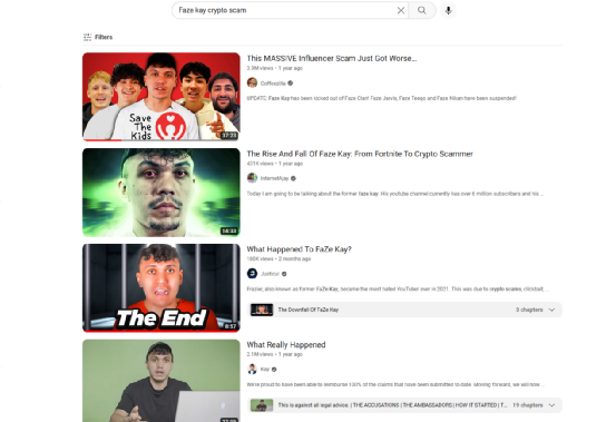这位至今仍拥有600多万订阅者的油管博主,其所参加的——或者说只是暴露出来的虚拟货币项目,便高达7次。包括save-the-kids Token在内,他至少从投资人身上榨取了3000万美元的资产。即使Faze Kay的“事迹”被油管知名打假侦探Coffezella深度挖掘并曝光,Faze Kay也只是息事宁人,装死了一段时间后,便再度回归油管,做起了无事发生的博主。