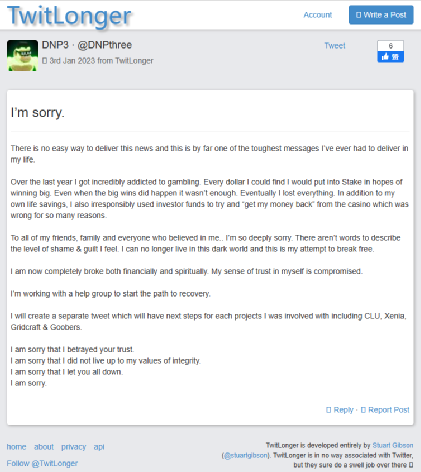 2023年1月3日,一位名为DNP3的Twitch主播,在推特上发布了自己的道歉声明。他声情并茂地向所有投资人表示忏悔。因为一次失误,他染上了赌瘾,输光了所有的投资。